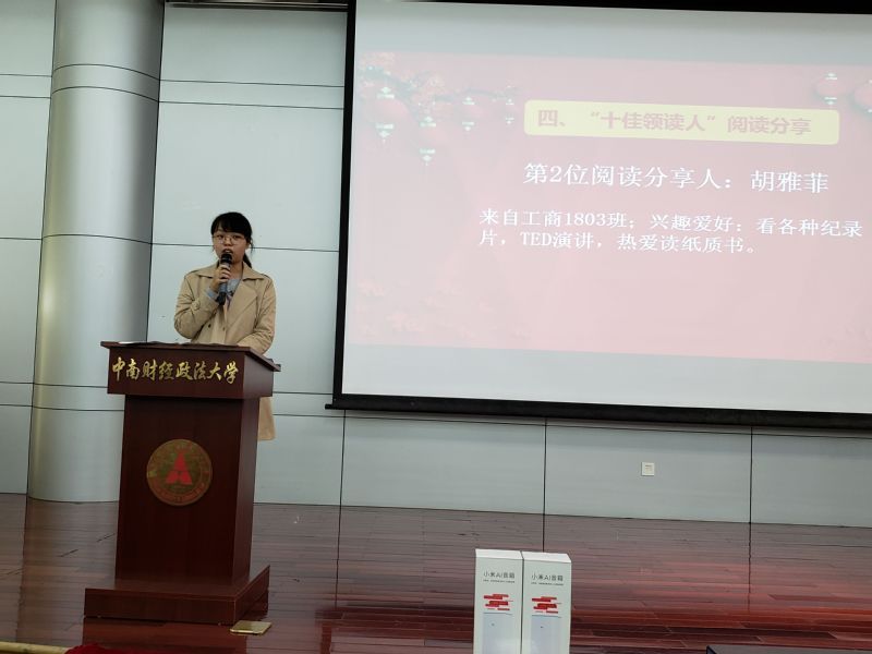 次阅读活动中有不少2018级新生,作为他们的代表,来自经济学院国际商务1802班的董婷婷同学在现场为大家分享了自己专注阅读,心醉《红楼梦》的阅读心得,通过对《红楼梦》中人物的反复认识和理解,一遍遍在书中和心里做对比,才能让人物显得灵气且丰满;工商1803班的胡雅菲同学结合自己在21天中的阅读和打卡内容,鼓励大家善于运用图书馆提供的平台和资源,寻找最适合自己的阅读方式并坚持阅读。
