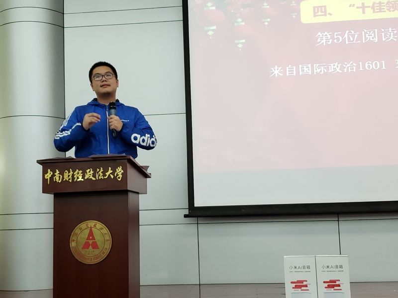颁奖典礼现场,邀请了7位获奖嘉宾作为“领读人”,为大家分享他们的阅读感悟和人生故事。本次“阅跑中南”21天阅读挑战赛冠军,来自哲学院国际政治1701班的闫畅同学在现场分享会上结合自己中学时期的阅读小故事,畅谈关于阅读、关于习惯、关于分享的点滴心得,他说:“读书固然重要,但也不能局限于书中,要多出去看看,不要忽视这种观察、这种思考,不能丧失自己的观察创造能力,要在这个分繁杂绕的世界学会成长。其次,21天,是养成一个习惯的最短周期,“阅跑中南”活动敦促我们每天读书,这个活动结束后,我依然会翻开书,静静的去找与自己共鸣的点,希望我、希望大家可以一直坚持下去。活动结束,阅读不止。”