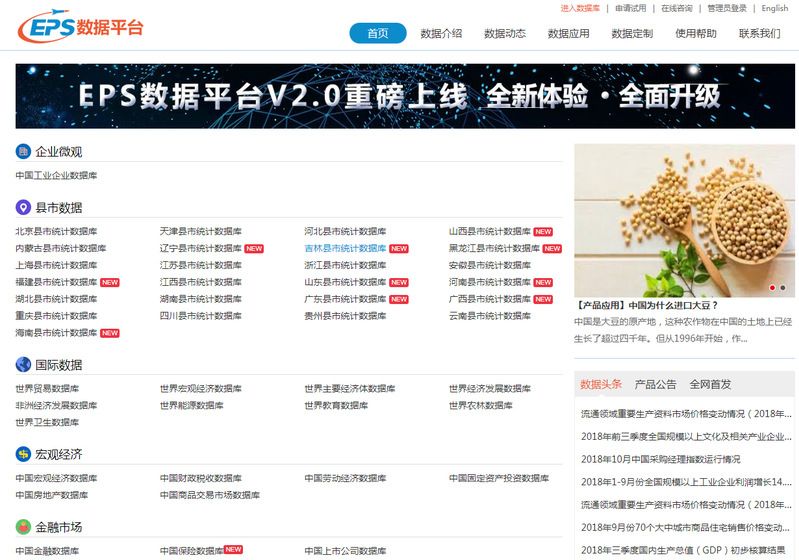 EPS(Economy Prediction System)数据库是北京福卡斯特信息技术有限公司提供的统计数据服务平台,其子库包括:联合国贸易统计数据库(WTD)、世界能源数据库(WED)、国际货币基金组织数据库(IMF)、世界银行数据库(World Bank)、经济合作与发展组织数据库(OECD)、中国宏观经济数据库(CMED)、中国工业企业数据库(IED)、中国工业产品产量数据库(POD)、中国进出口贸易数据库(CEITD)。
