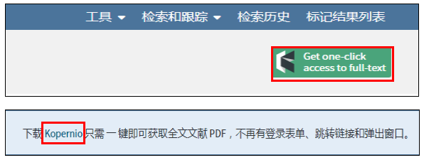 点击进入如图所示界面,提示我们只要下载并安装浏览器插件:kopernio, 就可以获得一个极大的福利,在web of science平台上,研究人员可以一键获取全文文献了!