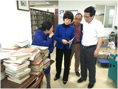 4月22日上午,图书馆领导班子亲临现场进行指导。馆长黄金初强调剔旧工作应注重方法的科学性和过程的规范性,要求馆员严格按照相关制度与规范开展工作;白学娟副馆长从剔旧方法上对馆员进行了指导,并提出剔旧的文献资源应得到高效利用,各学院可根据需要申请转移相关专业文献资源至学院分馆;陈建华副馆长就该项工作与馆员们进行了充分地交流。