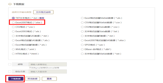 接下来就是下载数据了,如果用SPSS或者MATLAB分析,则可以下对应的数据格式,不过通常来说excel就够用,因此我选择excel2007格式,选择后点击“下载数据”。