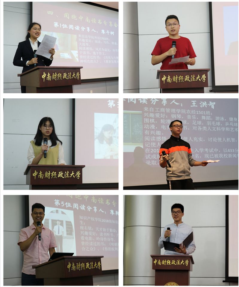 颁奖典礼现场,图书馆还邀请了5位获奖同学作为阅读分享嘉宾,和大家分享他们的阅读感悟和人生故事。法学院的廖千树同学,与大家分享了她在本次“阅跑中南”活动中阅读的《月亮与六便士》等书,她认为“风月为益友,诗书是良师。劳于读书,逸于作文”。金融学院的研究生刘莅同学,向大家介绍了自己的名字“莅”字的含义,并就自己的兴趣爱好如阅读、健身和大家进行了交流。金融学院的杜晓倩同学,在本次“阅跑中南”活动中以清新风格的打卡内容吸引了大家的目光,她向大家分享了她所阅读的图书《生活,是很好玩的》,引起了在座同学们的浓厚兴趣,她认为“一千个读者有一千个哈姆雷特”,每位读者在读过书后,都会有自己的感受,在我们上传打卡内容的同时,也会从他人的打卡内容中得到启发。工商管理学院的王洪智同学,首先分享了自己读书的感悟,与其重视读书的方法,他更加重视读书过程中自己内心的收获;在2019年硕士研究生入学考试中,王洪智以初试433分的优异成绩被我校新闻学院录取,应同学们的要求,他分享了自己考研的经历和心路历程,他认为读书使人充实,讨论使人机智,笔记使人准确。知识产权学院的研究生廖翔坤同学,在本次“阅跑中南”第二季活动中,他以风趣幽默又好听的声音吸引了大家的注意,我们也成功的记住了“坤坤”这个名字。