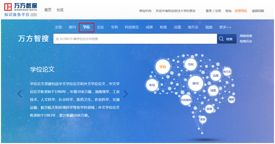 检索入口:图书馆主页——中文数据库——万方数据库——点击“学位”,即可在检索框中检索学位论文。可按题名、作者、中图分类号、专业、关键词、摘要、导师、学位授予单位进行检索。