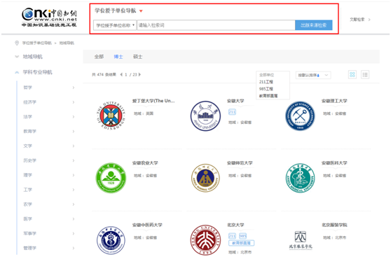 也可以选择“学位授予单位导航”,按学位授予单位来浏览学位论文。