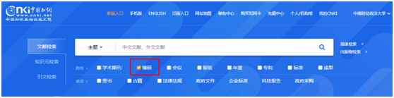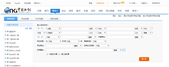 检索入口:图书馆主页——中文数据库——中国知网数据库——勾选“硕博”,在检索框中检索,或点击“硕博”,进入硕博论文库高级检索界面。可以按照题名、作者、导师、学位授予单位、中图分类号、学科专业名称等字段进行检索。