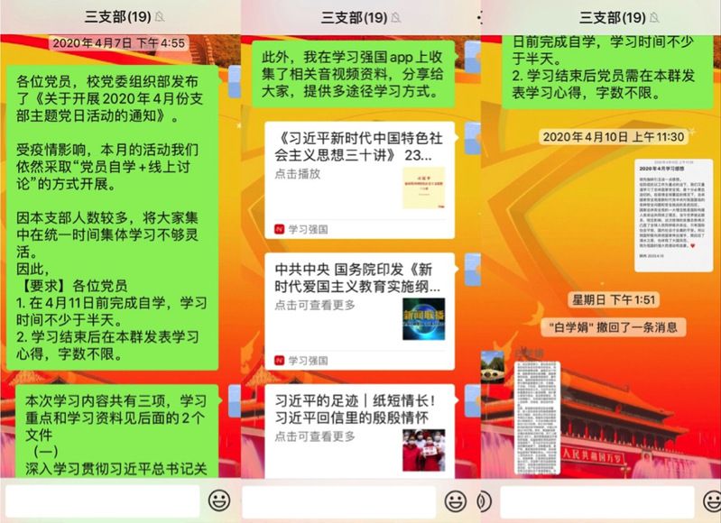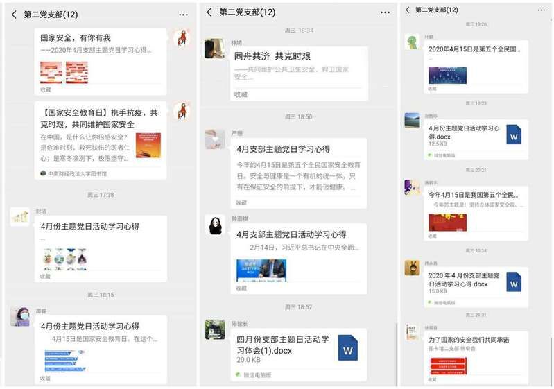 (通讯员 刘佳宇)在学校和图书馆的安排部署下,2020年4月7日至16日,图书馆第一至第四党支部结合“4·15”全民国家安全教育日宣传教育活动,组织开展了一次特殊的党支部主题党日活动。全面践行总体国家安全观,慎终如始抓好疫情防控,统筹做好复工复学准备。本次活动采取“党员自学+线上讨论”的方式,以微信群为阵地开展主题教育活动及学习讨论。