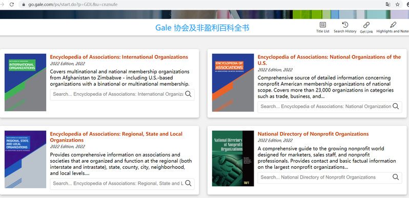 名录包含《协会大百科全书》国际组织版、美国版、美国地区版,以及《美国非盈利组织名录》等4种名录,可以查看国际上和美国国家、地区、州及地方的各个领域近46万个非营利组织成员的信息(见图1)。