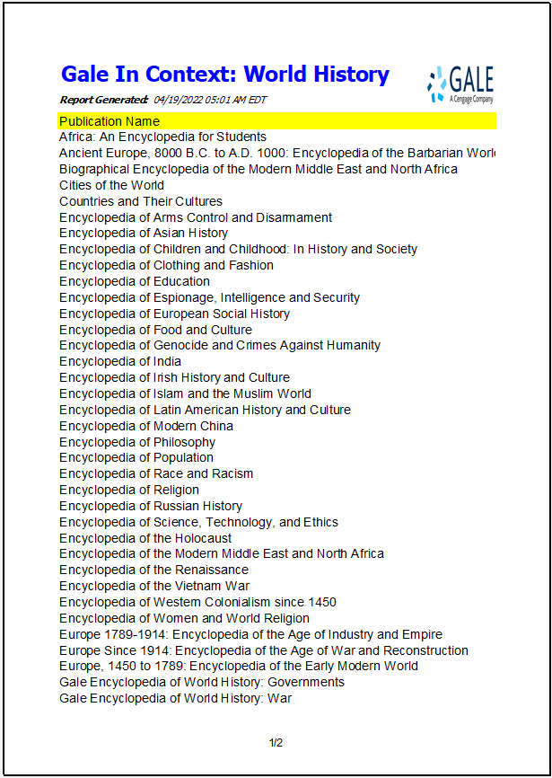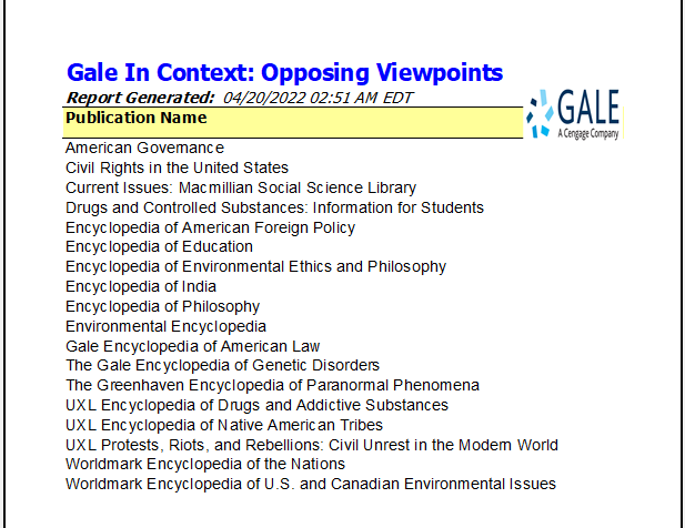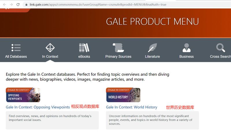 Gale公司是参考工具文献出版商。该数据库除了定型的词典及百科全书、年鉴、研究报告外,还有提供参考支持的及时更新的手稿、报纸、新闻专线、期刊、图书、研究报告、案例、小册子、音频视频、地图集、传记资料等等,我校可以访问的Gale数据库子库有机构名录、世界史语境库、相反观点语境库、全球商业洞察数据库,5个文学系列子库,以及泰晤士报。