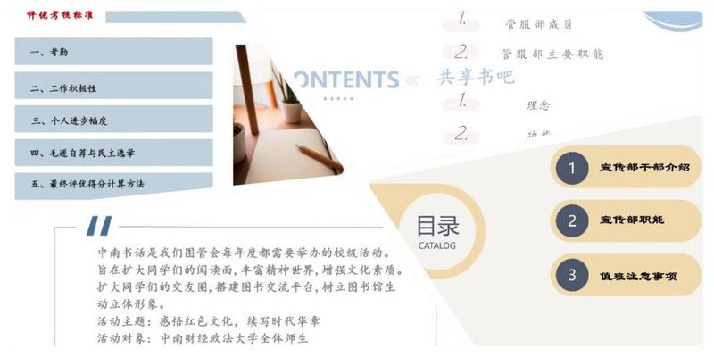 办公室部长苏文静介绍了办公室工作,着重讲解了考核评优标准。管服部副部长钱垚简述了管服部职责,并介绍了“共享书吧”活动,期待馆员们的积极参与。宣传部部长柴杨航介绍了宣传部负责的日常宣传和新媒体运营工作。策划部部长李芮萌介绍了策划部举办的各类活动,并详细介绍了 “中南书话”活动。
