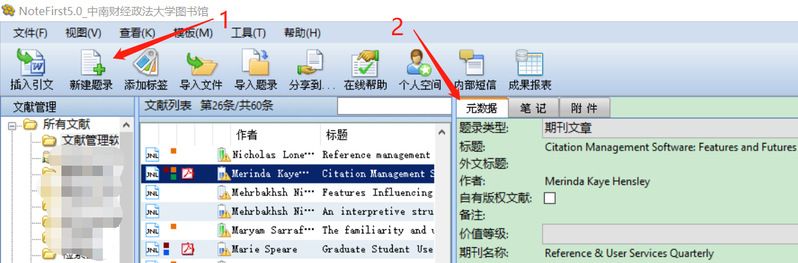 1.具体做法是在Notefirst菜单栏点击“新建题录”——点击右侧“元数据”,再根据文件类型,输入相关题录信息;