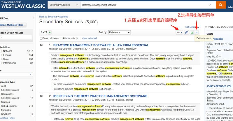 2.以Westlaw为例,如图19在Westlaw中检索出文献后,勾选已选定的文献,点击文献列表上方最右侧倒三角出现浮动“Delivery Menu”,点击“Download”后;