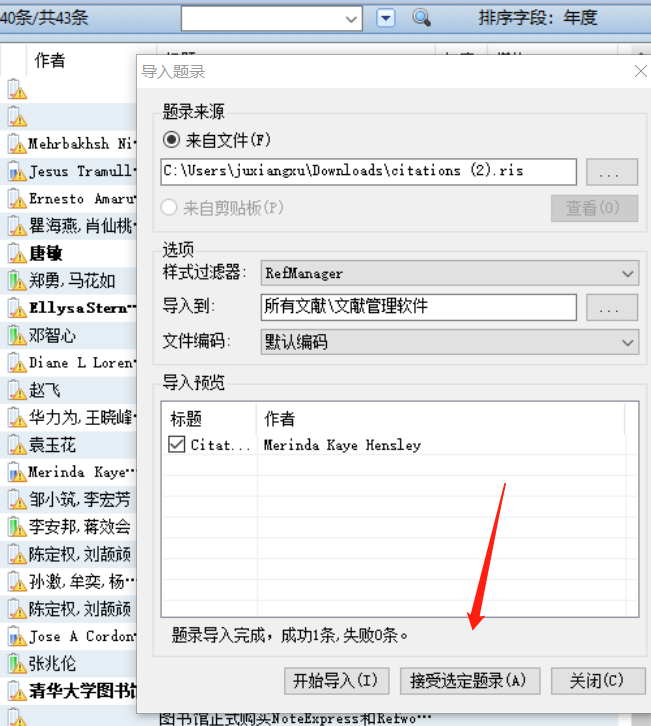4.回到Notefirst中的文件夹,点击工具栏中的“导入题录”——来自文件——选择下载的文件点击“开始导入”——“接受选定题录(见图4);