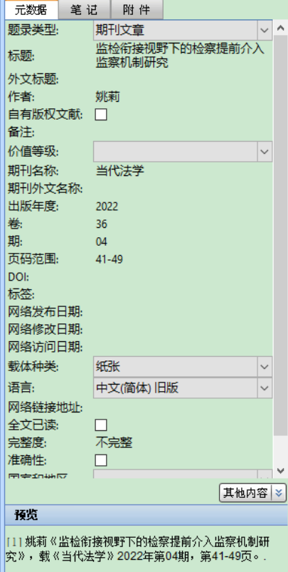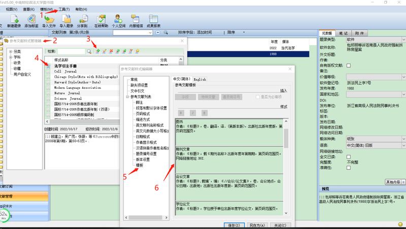 1.法学引注中的要求的“载”在模板中都属于“特殊符号”进行添加,如国标中的期号和页码范围,在法学引注“第”“期”“页”都被当作“著录用符号”进行添加,其他类推。