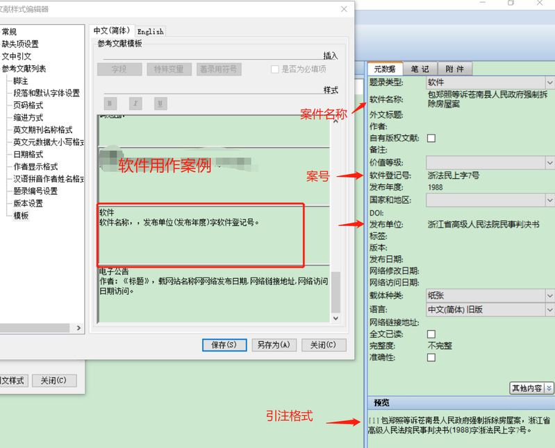 2.法学引注中的法律法规以及规范性文件、案例等常用的文献题录类型,Notefirst没有,笔者的做法是将“参考工具”模板当成法律法规及规范性文件,将“软件”修改成“案例”(见图24,图中“软件”指案例,“版本”指案由,如民事、刑事…,软件登记号指案号)