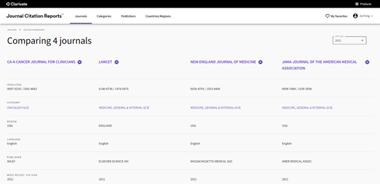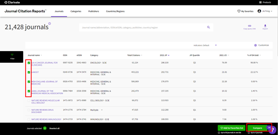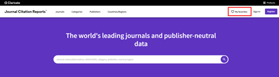 打开JCR主页,点击右上角“My favorites”,查找并选自己感兴趣的期刊,可以添加进自己喜爱的期刊列表,还可以同时对比最多四种期刊的详细信息,包括期刊基本信息、期刊分区排名以及期刊表现等指标。