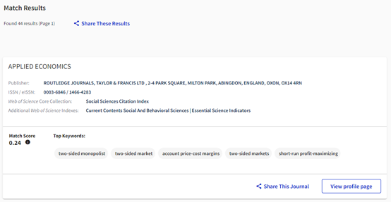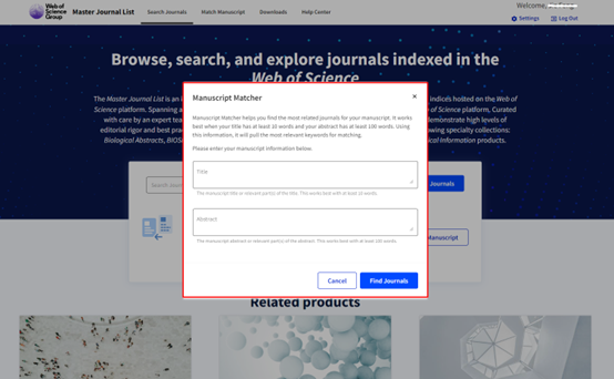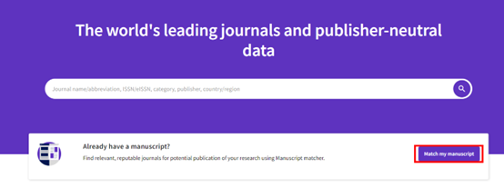 打开JCR主页,选择“Match my manuscript”,注册登录后,输入文章标题和摘要,即可查询到匹配投稿期刊。