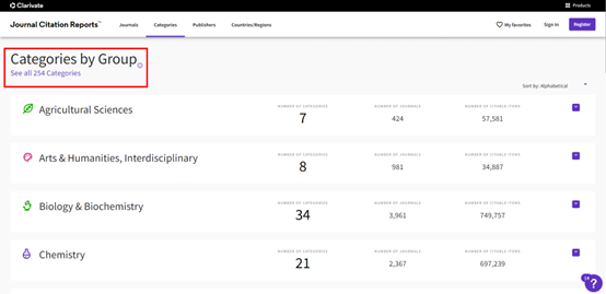 打开JCR主页,点击“Categories”,选择学科大类下的特定学科领域,即可查看特定学科领域的权威期刊。JCR将所有学科分为21个群组,254个学科类别。
