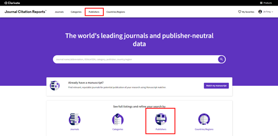 打开JCR主页,点击“Publishers”,即可查看5228本刊物的出版商信息,也可按期刊名、期刊ISSN/eISSN号、期刊类别等字段检索期刊。