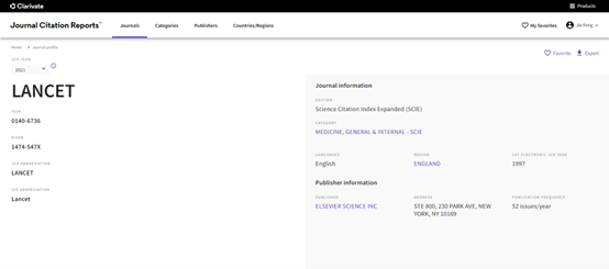 在JCR主页检索自己感兴趣的期刊,检索字段可为期刊名、期刊缩写、期刊ISSN/eISSN号、期刊类别、出版商、国别/地区,查找到某一本期刊后,即可查看该期刊的详细信息,包括期刊收录类别、期刊历年影响因子、期刊引证情况等详细的期刊表现,帮助您快速掌握该期刊信息。