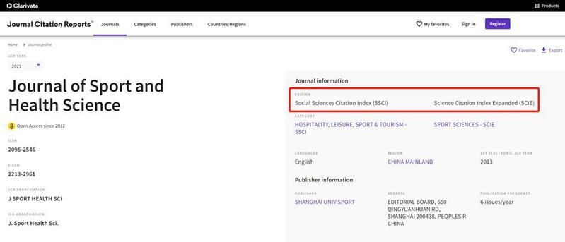JSHS是由上海体育学院主办的中国大陆第一本英文版体育学术期刊,由爱思唯尔出版。现被Web of Science(SSCI/SCIE双收录)、Scopus、PubMed Central、CSA、CSCD、DOAJ等数据库收录。本刊为双月刊,主要刊载运动医学、运动损伤预防与临床康复、公共健康促进、慢病运动干预、身体活动流行病学、锻炼与脑健康、运动生理学、运动心理学、运动生物力学、运动生物化学与营养、体育教育学、中国传统体育与健康等研究领域与方向的体育学术论文。