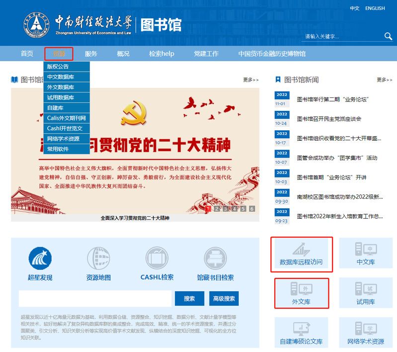 通过如下三种方式进入图书馆数据库列表:①图书馆主页——资源——外文数据库;②图书馆主页——外文库;③图书馆主页——数据库远程访问(非校园网环境请使用数据库远程访问)。