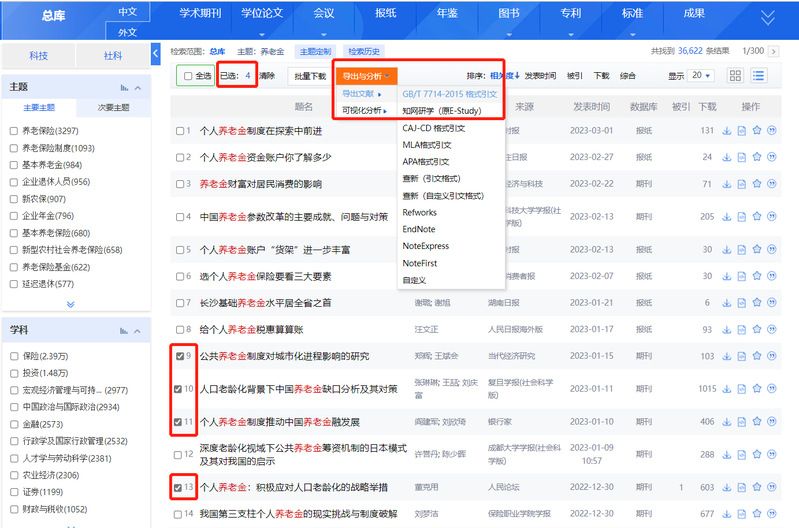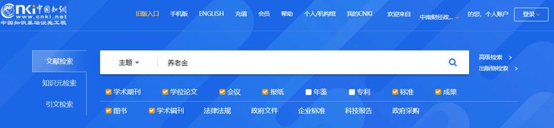 以中国知网为例,在中国知网首页用任一检索词(如“养老金”)进行主题检索。
