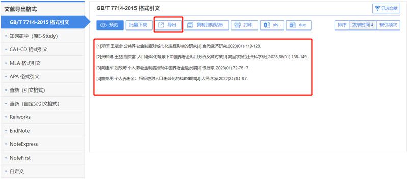 在页面左侧可选择文献导出格式,确认无误后,点击“导出”即可将参考文献进行保存和编辑。