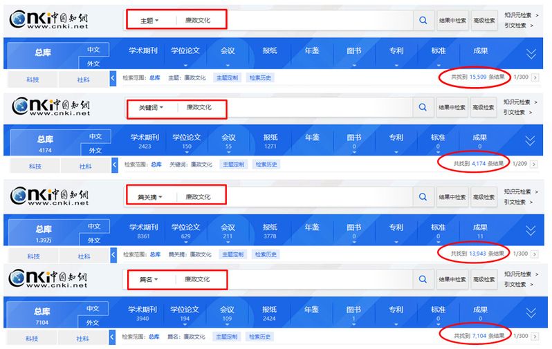 在进行检索的时候一定要注意检索字段的选取,不然检索结果可能会出现极大的差异!例如以“廉政文化”为检索词,采用不同的检索字段,检索结果差异化明显。