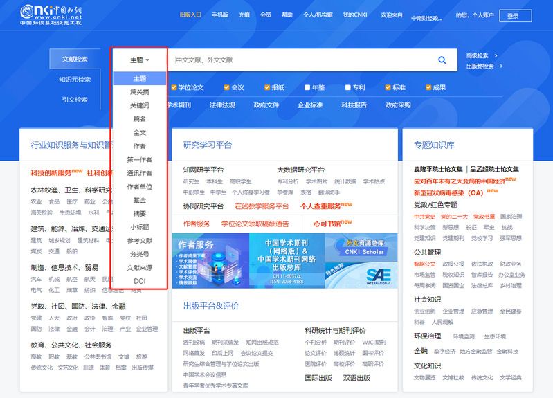 进入CNKI主界面,在检索框前会有检索字段的选取,系统默认的检索字段为“主题”,下拉选项发现,CNKI除“主题”字段以外,还提供了“篇关摘”、“关键词”、“篇名”、“作者”等16种检索字段。