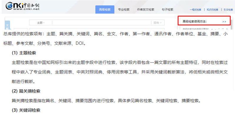 例如CNKI主页上的“高级检索使用方法”,进入以后会对总库提供的16种检索字段有具体的说明。