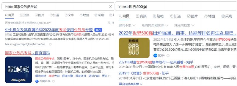 (2)检索网页标题/正文中含有某一检索词的内容。检索式为intitle/intext:检索词。