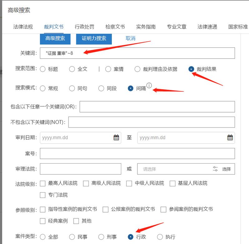 图7 证据与重审间隔词数为14字以内行政诉讼案检索图(北大法宝)