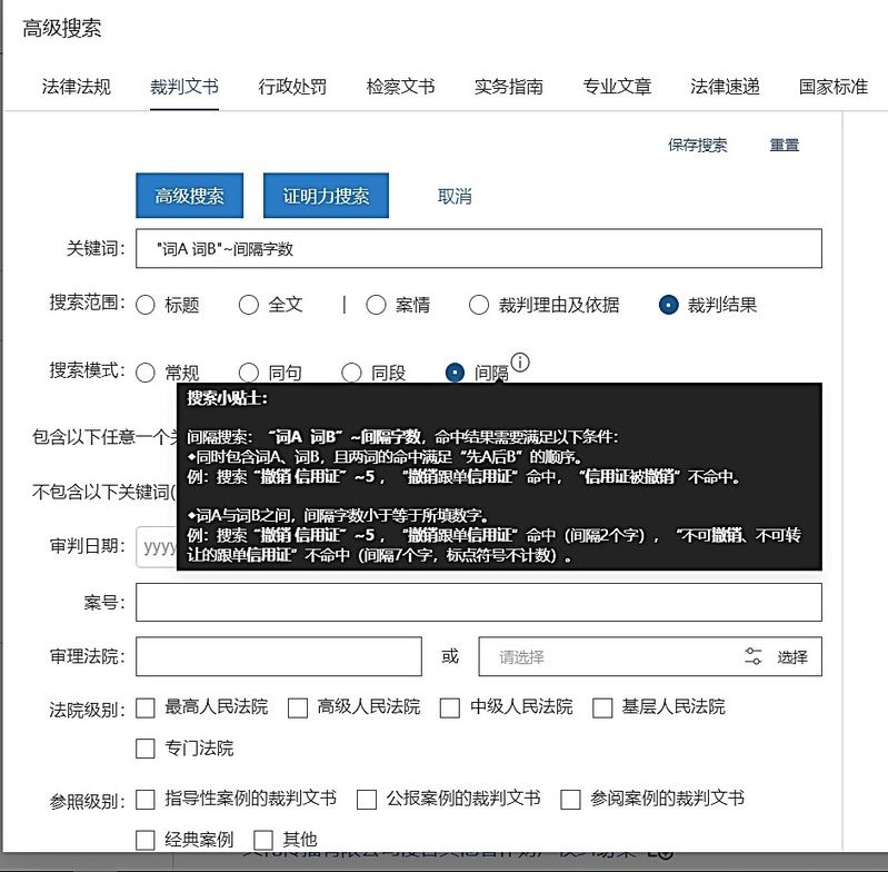 检索者根据检索目的更换检索词及间隔字数,想了解效果如何,可将鼠标光标放在搜索模式选项中的“间隔” 后上标的i 上面,会浮出“搜索小贴士”(见图1)。比如,调整间隔字数为14字以内的“命中结果”有所不同(见图3),可点击图中“裁判结果”查验“命中结果”。