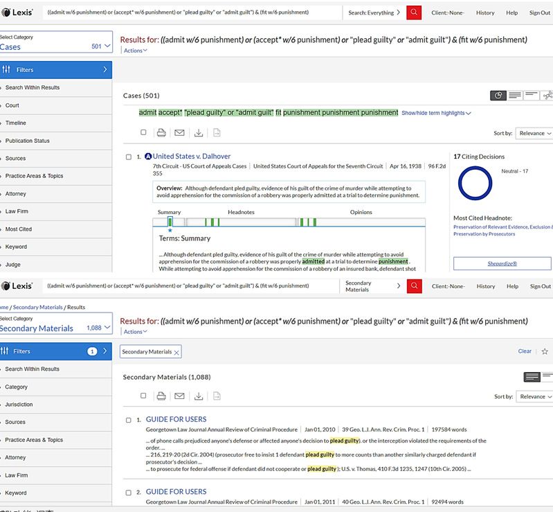 在Lexis中输入与Westlaw中检索含义相同的检索式(见图9、图10),Lexis的在间隔词数前置符多加一个w(单词的缩写),其检索式为:((admit w/6 punishment) or (accept* w/6 punishment) or "plead guilty" or "admit guilt") & (fit w/6 punishment) (见图10)。