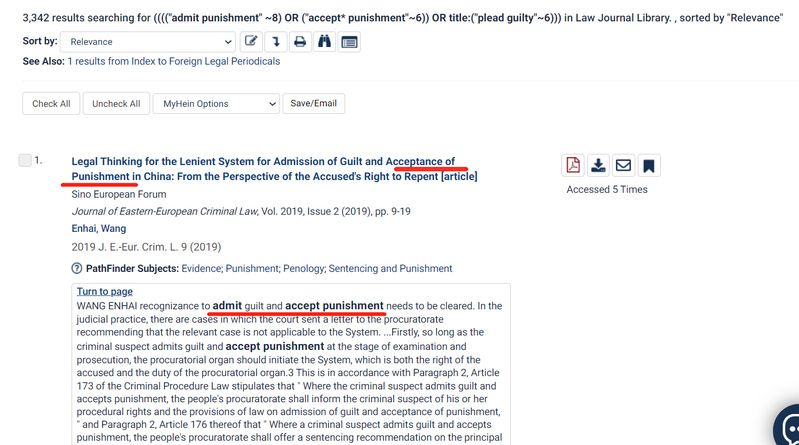 根据在HeinOnline中检索结果,演示Westlaw间隔词检索时,在认罪认罚方面新增了关键词“admit guilt”,每组词的检索关系仍为逻辑或(见图8)。