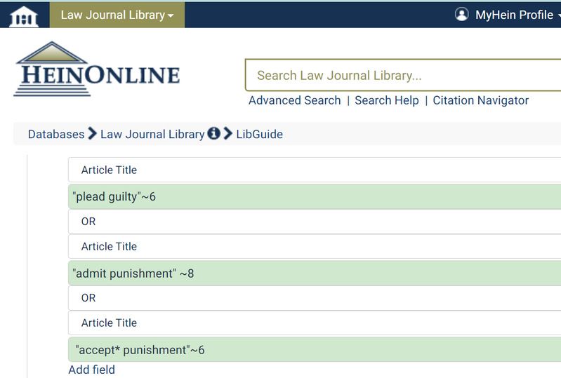 HeinOnline间隔词检索法的使用与威科先行相似,点开“Advanced Search”选择高级检索法,增加字段(Add field)检索(见图4)。在HeinOnline期刊库中,以布尔逻辑中的“逻辑或”,演示在文章题目中检索有关认罪认罚的相关文章。检索式为: "plead guilty"~6 OR "admit punishment" ~8 OR "accept* punishment"~6(见图4)。