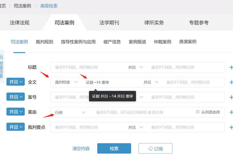 本文在中外文法律数据库使用的例子是:在裁判结果中检索,因证据原因发回重审的行政诉讼案。在外文数据库中检索认罪、认罚相关一二次文献,检索案例时补充认罪认罚在量刑上的考量,以缩小检索范围。检索式中的“A”、“B”分别代表检索中使用的关键词,“n”代表关键词之间间隔字数,“~”、“/”以及“w/”是不同数据库间隔字数的前置符。