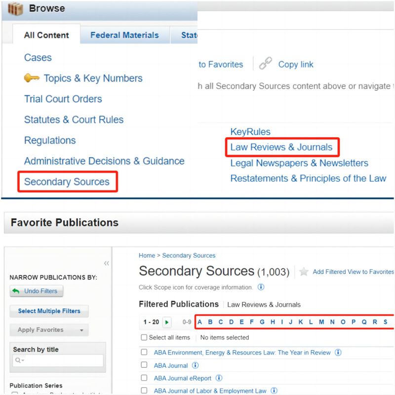 2. 美国法学期刊浏览方式:依次点击“Secondary Sources”——“Law Reviews & Journals”。