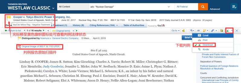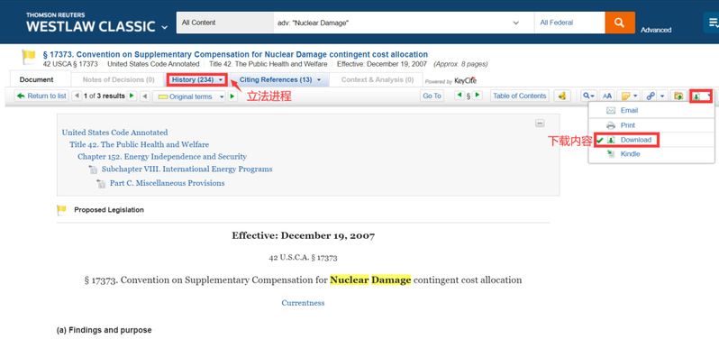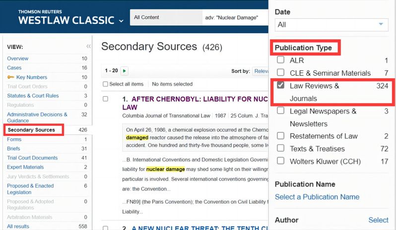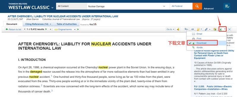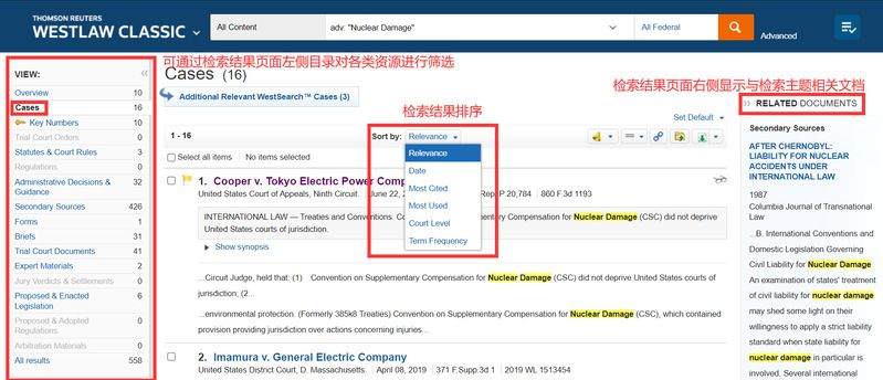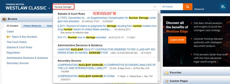 在Westlaw Classic法律数据库中检索“核损害”相关判例、法典和期刊论文等信息基本步骤如下: