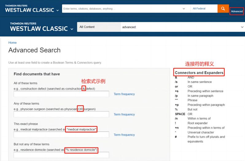 在Westlaw Classic法律数据库首页上方检索框的右下角,点击“Advanced”,即可进入高级检索界面。同时,在各个子库检索框的右下角,点击“Advanced”,也可分别进入各个子库的高级检索页面。需要注意的是,各个高级检索页面前4个字段均相同,其他字段则因子库特点而略有不同。