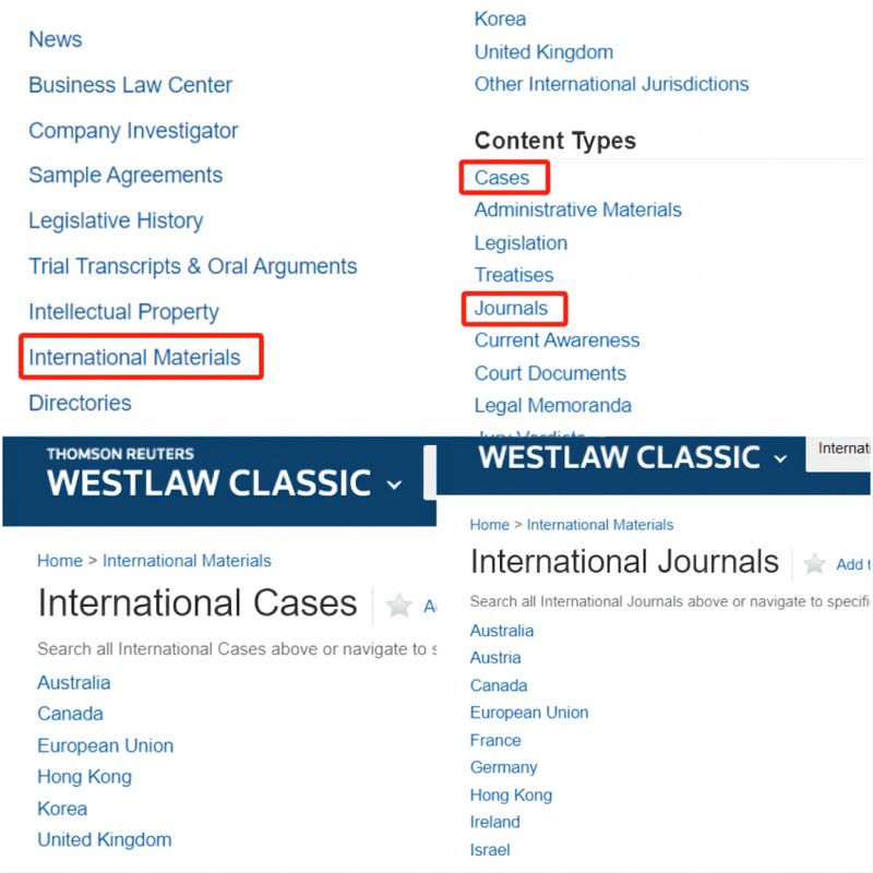 3. 美国以外其他国家和地区判例、法学期刊浏览方式:依次点击“International Materials”——“Cases”/“Journals”。