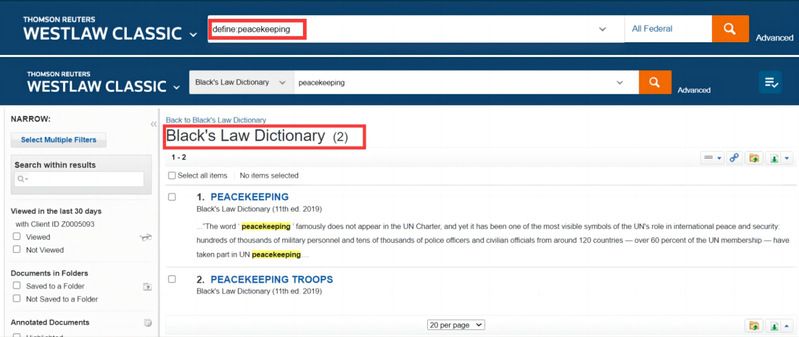 另外,在Westlaw Classic法律数据库首页检索框中,输入“define:检索词”进行检索,若该检索词被布莱克法律大辞典收录,则可检索到相应结果。