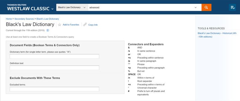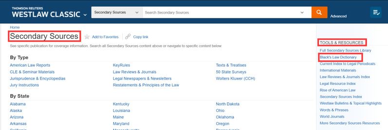 Westlaw Classic法律数据库独家收录了布莱克法律大辞典第十一版,我们可以从中查询常用法律术语的规范解释。从首页开始依次点击“Secondary Sources”——“Black's Law Dictionary”,即可进入该辞典查询使用界面。