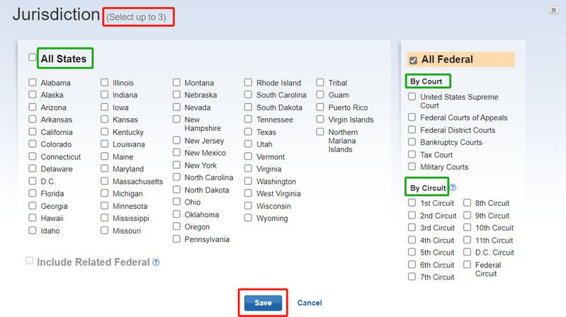 在检索框右侧,默认检索法域范围为“All Federal”,可通过点击“All Federal”对检索法域范围进行调整,每次最多只能限定3个选项,勾选完毕后,点击“Save”保存选项。