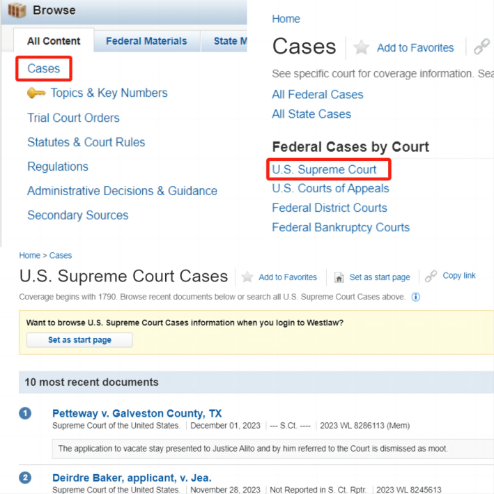 1. 美国最高法院近期判例浏览方式:依次点击“Cases”——“U.S. Supreme Court”。