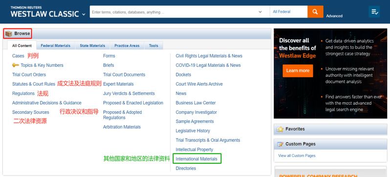 在Westlaw Classic法律数据库首页,“Browse”部分左侧,可通过点击各子库直接浏览美国的法律信息,美国以外其他国家和地区的信息可通过点击右侧“International Materials”进行浏览。