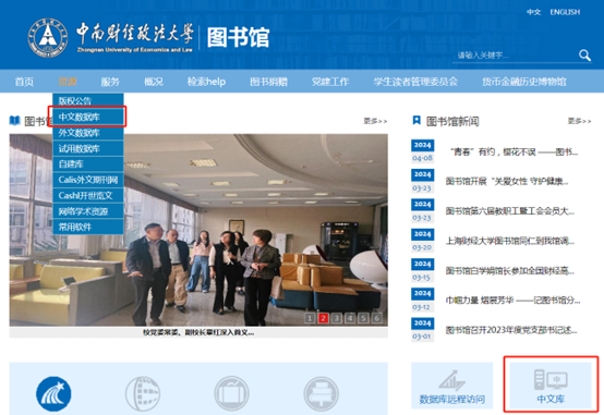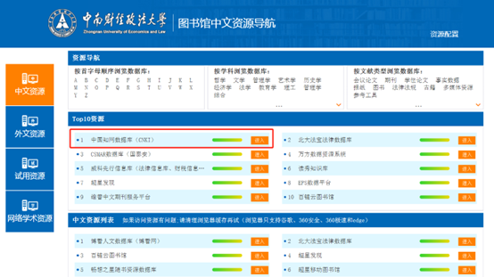 首先,进入图书馆主页(https://library.zuel.edu.cn/),选择“资源”→“中文数据库”或者直接选择“中文库”,进入图书馆中文资源导航页,找到中国知网数据库(CNKI),点击“进入”。
