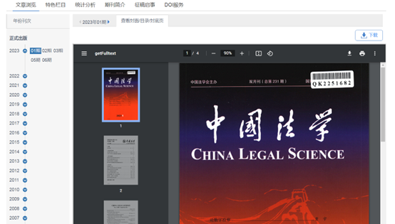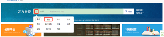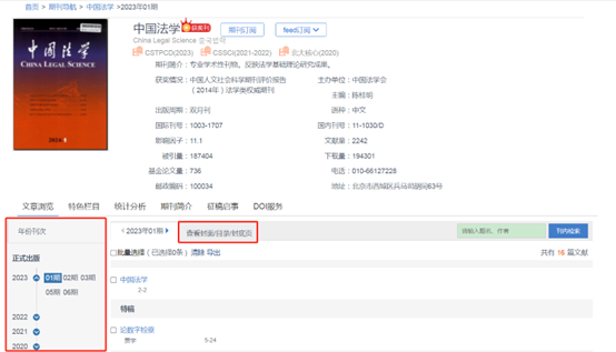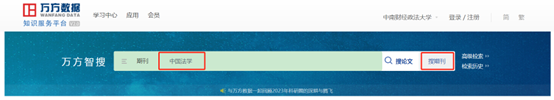 进入万方数据库资源系统主页(方法同上文),选择“期刊”检索,以《中国法学》为例,点击“搜期刊”,在检索结果页面选择所需期刊,进入该期刊的导航页。