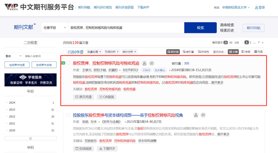 进入维普中文期刊服务平台主页(方法同上文),以《股权质押、控制权转移风险与税收规避》这篇文章为例,进行检索。在检索结果页面找到所需文章,点击进入文章详情页。